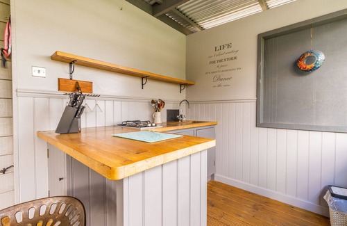 The kitchen facilities include a Fridge, freezer, gas hob stove, kettle, and sink. There’s a dining table and chairs for two, with a second kitchen and additional worktop cooking space.