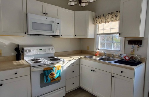 - Modern , farmhouse basement, suite, queen bed, efficiency , dogs welcome.
