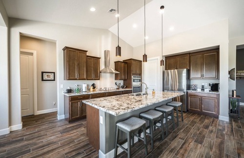 Our home in Wickenburg Ranch has it all! Located an hour from the Phoenix Sky Harbor International Airport and 30 minutes north of Surprise AZ, it’s the perfect location to enjoy the best of both worlds between city and country. We require 1st of the month check-in and end of month checkout. This house is 2200 sq. ft. of comfortable living space and fully furnished with everything needed to make your stay enjoyable and relaxing. An open floor plan gives a large welcoming feel with the primary suite and guest bedroom on opposite sides of the living area. The gourmet kitchen is fully stocked with everything needed to prepare and cook meals including a large walk-in pantry with an additional beverage refrigerator. A home office, complete with printer, is perfect for computer time or remote work. Our backyard is very private and takes in beautiful views of the desert and mountains. It's appointed with a BBQ area, water feature and multiple seating areas including a fire table.
