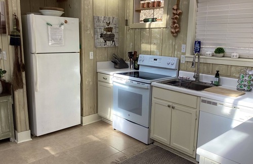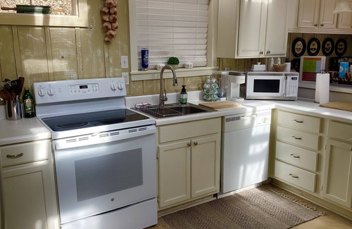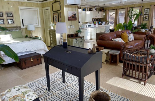 The studio has a spacious feel with open area bedroom, full bath and family room featuring flat panel cable TV with DVD. Sunshine fills the living area by day, and the fire pit and chairs afford cozy nights by the fire. The fully equipped kitchen features oven, stove, refrigerator, large microwave, dishwasher, toaster, coffeemaker and additional small appliances. The dining table with chairs can seat up to four. You have everything you need to prepare a homemade family feast. Completely refurbished with new bathroom, appliances and furnishings.