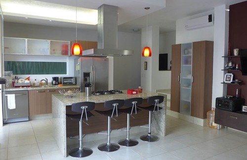 It is a 2 story house. On the first floor you will find an automated main garage for one big car. A fully equipped kitchen including microwave, dishwasher, coffee maker, stainless steel refrigerator, wine cooler, pans, pots, etc. a granite countertop which can be used as a dining area along with 4 stools, enough pantry, and everything as a part of the principal area, just adjacent from the terrace and the pool.
