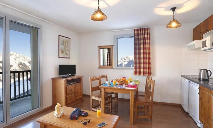 Situated close to the shops at about 500m from the ski slopes, the residence Le Hameau de Balestas, Peyragudes, Pyrenees, France comprises of 6 terraced chalets built in Pyrenean style and 3 other buildings which are divided by districts : La Belle Sayette, Le Forum, Les Abellans and Le Val d'Esquierry. Near the hillside of Peyresourde, each accommodation offers a magnificent view. Also available are free shuttles to get access to the pistes. You will take advantage of a free access at the indoor heated swimming pool of the residence. Surface area : about 32 m². Living room with pull-out sofa. Bedroom with double bed. Kitchenette with coffee machine, toaster, dishwasher, microwave, vitroceramics cooking rings, fridge. Bathroom with bath-tub or shower, WC.
