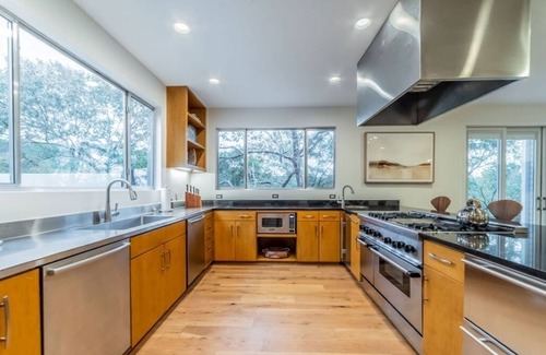 This 3-story home’s layout includes spacious rooms for the ultimate live/work flexibility. There are three master bedrooms with bathrooms attached and several outdoor living spaces to give you plenty of room to hang with family/friends, while also providing the separation for those times that you prefer your privacy. Three of the bedrooms come with desks for those travelers who like having the option to work virtually wherever they are staying. Gather in the large, gourmet chef’s kitchen with all of the modern amenities you would expect and share meals at the custom live-edge dining table which is big enough to serve larger groups. The spacious living room has ample amounts of seating and is equipped to host movie nights with surround sound speakers and all the streaming platforms readily available.