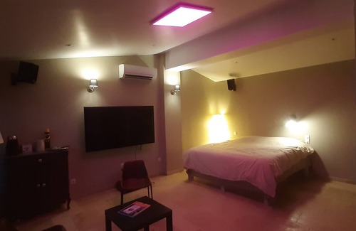(Text automatically translated) -> 100 + pictures available. comfortable farm renovated and decorated with taste - POOL HEATING with 26 ° guaranteed until late September. This house is in open fields without any noise. The nearest neighbor is 400 meters. Spa 5/6 places are available in a room of 35 square meters dedicated to relaxation. 6 bathrobes and slippers in your available. 6 adult ATV, Bonzini foosball, slide, swing, table tennis, DVD, Kart two seater pedal. Pool 10x5 with 1 Pool Lounge 8x4 equipped with a table and 2 covered 12 3 seater sofas with coffee table, a Pool Bar 4x4 with bar sink and stereo 2x80w and 8 chairs. The pool is lit by LED multiple color choices, the garden is lit by six spots. Barbecue Gas Grill + large format charcoal. in the countryside,