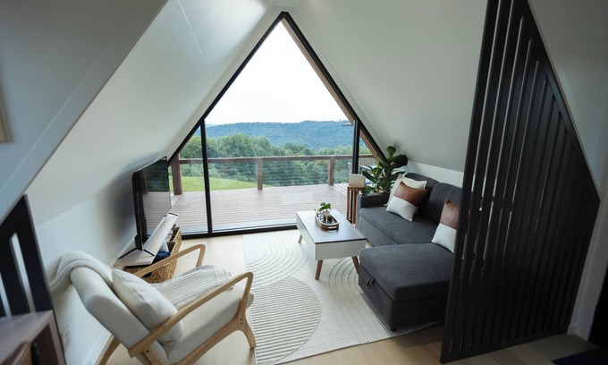 Enjoy the wild beauty of the Tennessee mountains at Wild Rose Ridge. The A frame tiny home has everything you will need for the perfect getaway, from the wrap around deck to the outdoor fire pit it is simply enamoring! When you step inside you are invited into a fully equipped kitchen that then goes into the living room, the couch does convert into a bed to comfortably sleep two extra guest. It may be a tiny house but it has a king sized bed as well as a full bathroom.