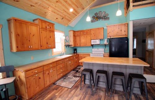 The Wild Rose Road Cabin features inviting amenities designed to make your stay exceptionally comfortable. The main cabin comprises two queen bedrooms on the main level and a loft with additional queen beds, ensuring ample space for your guests. The open-concept great room boasts a stunning 16-foot vaulted ceiling, a cozy living area, and a fully-equipped kitchen. You can also take advantage of the covered porch, fire pit, and scenic trails, creating opportunities for memorable moments and delightful celebrations. For those needing extra space, the "Rustic Rose" bonus room provides a charming retreat just steps from the main cabin, enhancing your group's accommodation needs.