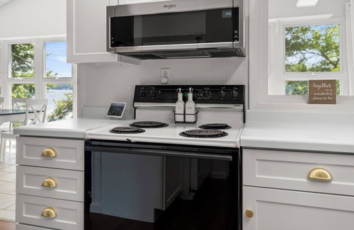 Step inside and enjoy a bright living room with huge windows framing the lake, a fully stocked kitchen for all your cooking needs, and a cozy sunroom with extra dining and sitting space perfect for your morning coffee. Upstairs offers two bedrooms — one with a king bed and one with a queen bed — plus a full bath.