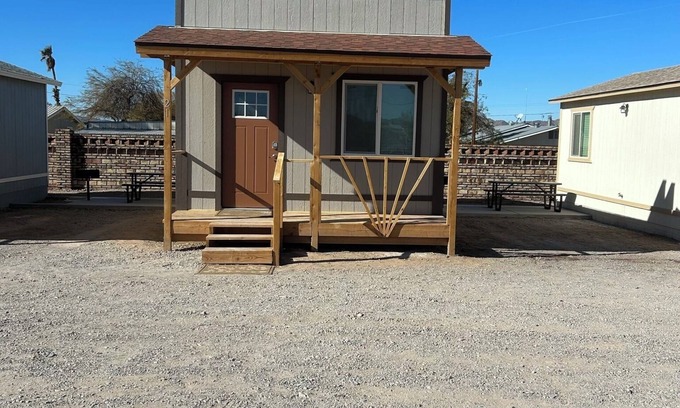 At American Trails RV Park, we offer charming wild west tiny homes, each under 400 Sq. Ft. but packed with all the comforts of a larger home. Our tiny homes feature a full bath, king-size bed, 2-burner stovetop, convection air fryer microwave, and coffee maker. Outside, enjoy a BBQ grill for outdoor cooking. With additional amenities like a refreshing pool, laundry facilities, and a welcoming clubhouse, our park provides cozy lodging experience in the heart of Quartzsite. Stay in this rustic gem.