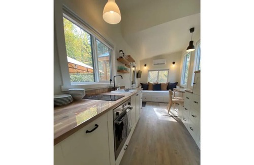 The tiny house is well laid out and has everything you need including a portable hot tub. It has a stocked kitchen, full size bathroom with washer/dryer combo, and full size hot water tank. It has a 3/4 size fridge and freezer, convection oven and induction stove-top.