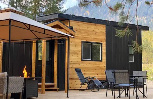 Brand new, modern and cozy tiny home, nestled in the trees on riverfront in a beautiful valley, hidden from sight. If you are looking for a nature get-away, you've just found it. It is just minutes from both Ymir and Salmo, and only 14 minutes drive to the Whitewater Ski Hill turnoff and just a 25 min drive to Nelson. In the loft is a queen bed, the couch downstairs pulls out to a king. The bathroom has a full size stand up shower and a washer/dryer. TV, Wifi, deck with gazebo and fire-table!