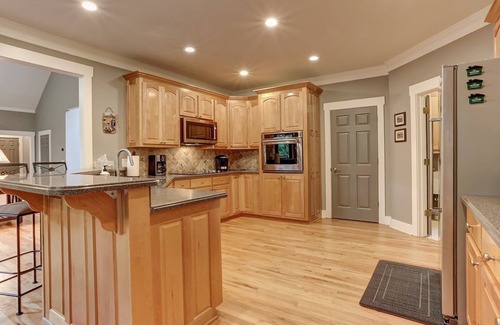 When you're ready to hit the hay, slip away to your queen or king suite — each with a private en-suite bathroom. The main bedroom even has direct access to a deck plus an indoor jetted tub for spa baths anytime! Additional amenities include a laundry room, free and fast Wi-Fi, a flat, paved driveway, parking for 6 (including 2 garages), and a wet bar to spice things up. Wilderness Lodge is waiting for your next fun and relaxing vacation in the Blue Ridge Mountains.
