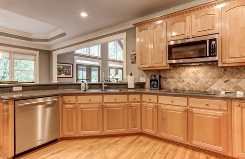 Back at the cabin, lounge in the living room with a crackling fire in the wood-burning fireplace or flip on the big screen TV to watch Netflix in the den. Crack open a good book in the bright and inviting sunroom or retreat to the covered deck with a close friend and a glass of wine. The open deck features a gas grill and a table with an umbrella for meals outside. You can also cook in the fully equipped kitchen and dine at the indoor table.