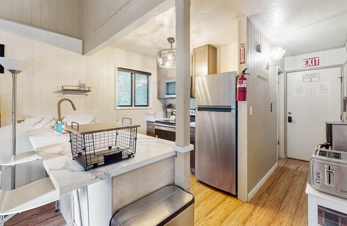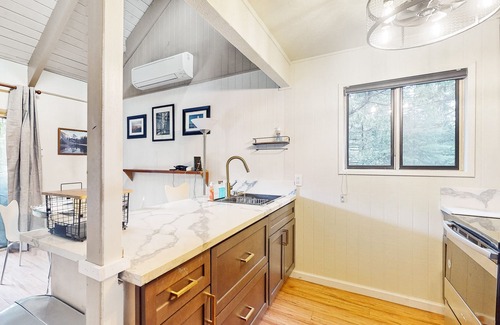 Inside, warm up and relax in front of the living area's wood-burning fireplace. Steps from here, the well-appointed, full kitchen boasts stainless steel appliances, a coffee station, and marble countertops. No modern convenience goes unnoticed as you and your guests will also enjoy access to a shared washer/dryer, partial air-conditioning, a streaming-capable TV (using your own accounts), and an EV charger. This unit is part of a duplex and is located on the second floor. You will share the main entrance with additional guests but will have a private entrance to your unit. The other unit is located below.