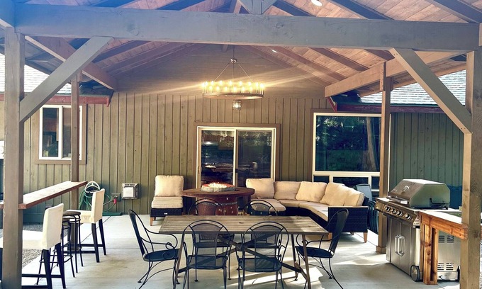 Step out onto the covered deck in the back, where to a cozy firepit—ideal for evening s’mores or stargazing (please adhere to burn ban guidelines in peak summer months). The spacious covered front patio extends the living area outdoors, wine barrel gas firepit, complete with yard games, a BBQ grill, and an outdoor dining setup for memorable meals in the fresh mountain air.