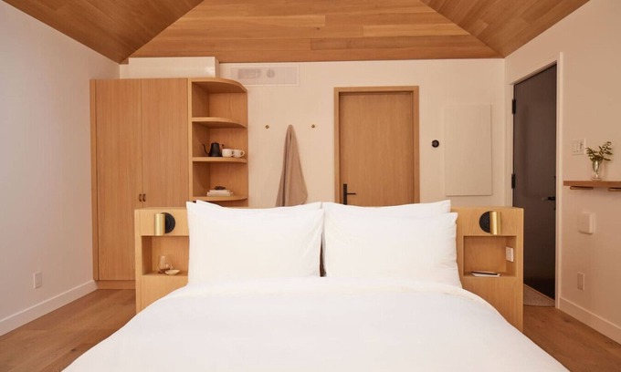 Each cabin suite is approximately 450 square feet and equipped with one organic queen bed, a walk-in shower, and a deep soaker tub. Interiors are modern and light-filled, featuring a private deck and window seat to quiet your mind and immerse you in nature. Cabins do not include a kitchenette - instead, enjoy chef-prepared meals serviced daily as part of your full-board retreat.