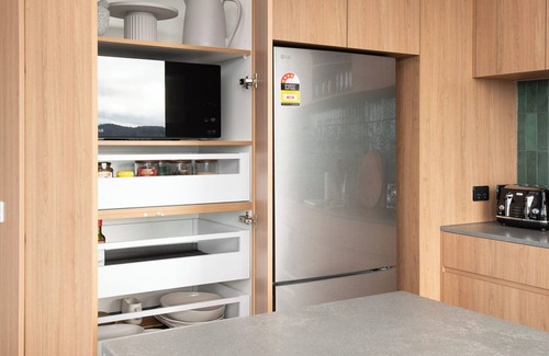 There's an outdoor egg shape bath to immerse yourself in & relax. Maybe have a cheeky glass of your favourite Tasmanian tipple, that you've prepared in the wet bar, whilst enjoying the serene outdoor ambience. The bathroom features a double shower with dual rain fall shower heads & luxury Tasmanian Millie Organics body wash, shampoo & conditioner.