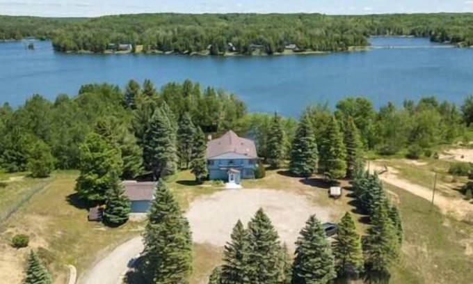 This lodge is placed on an elevated 3 acre lot over looking the lake with its own private island to sit by the camp fire.