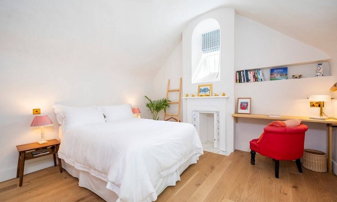 A solid poplar tulip wood staircase leads upstairs to a beautiful double bedroom with solid oak flooring and a vaulted ceiling to give a sense of space and light. The bedroom has been stylishly furnished with a chic farmhouse aesthetic with numerous characterful features including a tiled cast-iron feature fireplace with a marble hearth and a desk space ideal for guests wishing to bring a laptop and work.