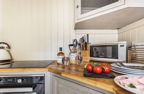 With an electric oven and hob, fridge/ freezer, microwave, washing machine and Nespresso coffee machine.