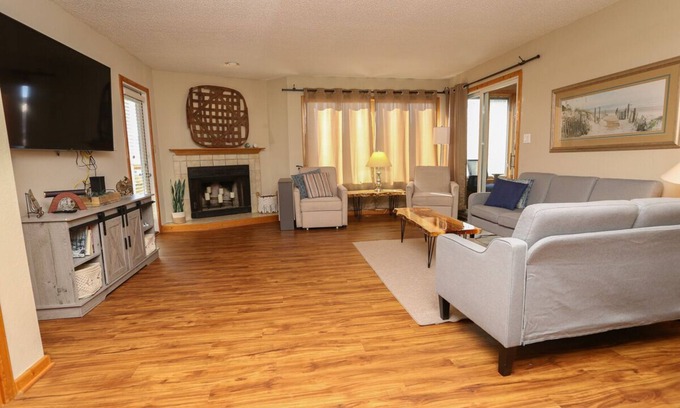 2 bedrooms (1 with King, flat screen TV, direct access to shared bath with tub and shower; 1 with Twins, flat screen TV, single sink vanity, and access to shared bath). Spacious living room with access to the covered porch and bonus sun room; fully equipped kitchen with eat in dining for 6 and two additional seats at the bar; laundry; dry entry from garage area.
