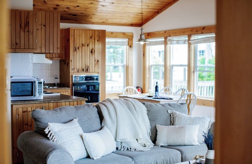 This cottage is an accessible cottage and can be reached via a ramp from the paved parking area adjacent to it. It is a 3-bedroom cottage featuring a king, queen, and double bed. The cottage is equipped with two full bathrooms, one of which has an accessible shower. Its interior is open concept that includes the living, dining, and kitchen area. The cottage offers a propane fireplace, a fully equipped kitchen, and an on-deck BBQ with propane provided. Wi-Fi and Internet TV included.