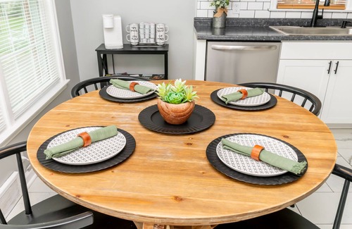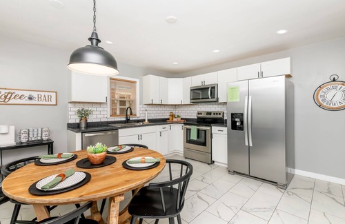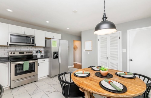 This property has been beautifully and thoughtfully renovated. There are 5 bedrooms, 3 bathrooms. a large living room and a lovely, bright kitchen. The living room includes plenty of comfortable seating, and a 50" smart TV. The kitchen is equipped with new appliances including Keurig coffeemaker, dishwasher and fully stocked with cookware. Beautiful hardwood flooring and tile throughout. There is no carpet. The bedrooms have queen size medium firmness memory foam mattresses with plenty of closet and storage space. Washer & dryer in the unfinished basement along with plenty of storage and a half bath. Wherever your day takes you rest assured you will have an inviting comfortable home to come back to. There is a large front porch for sitting and relaxing and a patio in the private backyard. There is also a 2-3 car garage for your use as well. Be the first to enjoy this renovated home with new furnishings!!