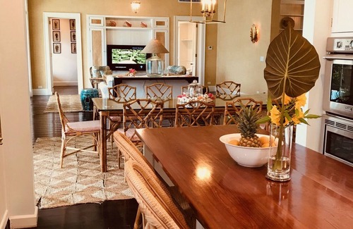 The great room, living and dining rooms all offer an 11-foot coffered ceiling, along with three pairs of French doors leading out to the lower veranda and stunning views of the harbour and Eleuthera in the distance. Guests enjoy the living room with oversized sofa, rattan chairs upholstered in Quadrille fabric and 65-inch smart television. The main dining area offers a bespoke rattan Chippendale dining table with seating for ten guests. There is also an outdoor dining area that seats 6.
