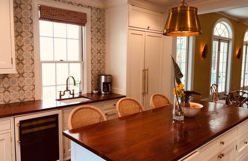 Off the great room is an oversized veranda with outdoor bar, wine cooler and sink. Take the steps down to the expansive lawn, teak chaise loungers and pool area.The downstairs master known as “The Imperial Room” offers a king sized 4-posted bed, tray ceiling, and antique dresser and ensuite bathroom and is decorated in the theme of the British colonial era. The other downstairs bedroom known as “The Bahama Room” offers a set of twin beds, tray ceiling, oversized closet and en suite bathroom and is decorated in colorful Bahamas prints and patterns.