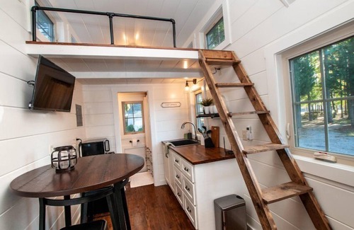 Loft living is what this BRAND NEW tiny home is all about! Located at River Rocks Landing right on the Coosa River. Want to get away for a little adventure but don’t want to set up a camper or trailer for the weekend? This home is right up your alley! Climb up a ladder to one loft to a queen bed, or take the other ladder to a twin bed in the adjoining loft. The kitchenette with a hot plate can whip up most meals, or bring a bbq to cook in the great outdoors. At night enjoy the smart TV with cable and WiFi throughout the space. The light walls with dark wood gives this home a contemporary look and feel. This tiny home is right on the river with views that will keep you coming back for more. Onsite you’ll have access to three pools, a children’s play area, and a game room. Stay for a weekend or the entire week, your group will have a great time in the Windsor Cottage! All sleeping areas are accessible only via ladder, please keep this in mind when booking this unit.