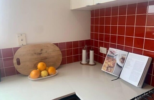 The kitchen comes with a full-size fridge, under bench oven, 4-burner gas cooktop and a dishwasher, with a red-tiled splashback adding style and colour.