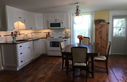Also on the main floor is a renovated bathroom, and a small country bedroom with a single bed, and a pull out queen sized bed in the living room. On the second level there are four bedrooms, all with plank pine floors and country décor. One bedroom has a queen size bed and three have double beds. High quality linens and towels are used throughout, changed weekly. There is also a newly renovated half bathroom.