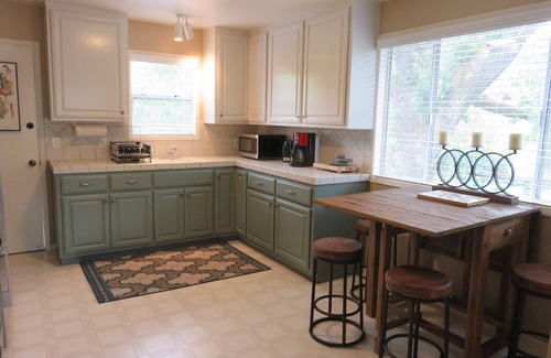 This newly renovated and freshly decorated 2 bedroom 1 bath home feels like your favorite sweater. Completely renovated and redecorated, the home features everything you would want in a home away from home! New Beautyrest beds, flat screen TV's in Living Room and each bedroom. Outdoor space calls to you, with its beautiful firepit and sectional sofa curved around it, all in a private fenced courtyard under the gracious towering Oak namesake. This is our 3rd vacation rental and we travel a lot ourselves; we really understand what our fellow travelers want in a home away from home. Fully equipped kitchen lets you prepare a meal from scratch, heat up leftovers, or bring in from any one of the many local restaurant choices. You'll love sipping a glass of wine in the evening, basking in the warmth of the gas firepit, as the gently gurgling of the waterfall soothes away your tensions and you get into SlowNoma-Speed!