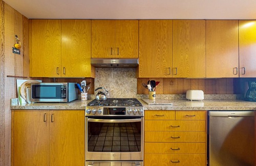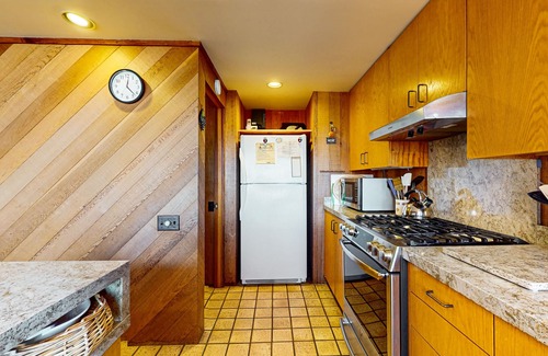 Inside this warm and very inviting home, you'll discover a tasteful blend of mid-century modern with high-end, contemporary amenities to ensure the utmost comfort for you and your guests. Lounge in the living area with its natural wood walls and lofty ceilings where you can get a fire going in the wood stove and take in the view through the many expansive windows. The well-equipped, full kitchen offers a complete suite of stainless steel appliances, while resulting meals can be enjoyed together at the nearby dining table or alfresco on your furnished patio.