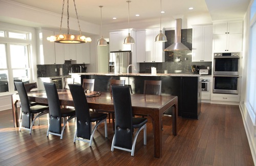 Entering the home, you're welcomed into a spacious great room with breathtaking lake views. Two oversized couches easily seat a dozen guests, who can enjoy conversation with the cooks in the nearby gourmet kitchen or watch a movie on the 70" television. The open great room flows into the dining area, which accommodates a party of 12 comfortably, and the peninsula kitchen with its nearly 13' island and bar. Chefs will enjoy the Samsung double flex oven, KitchenAid five-burner induction cooktop and Sharp microwave drawer. Two full-sized refrigerators, including a deluxe Samsung in the kitchen, a beverage center and industrial icemaker make it easy to store drinks and food for large parties, and two sinks and two dishwashers make for easy clean-up.