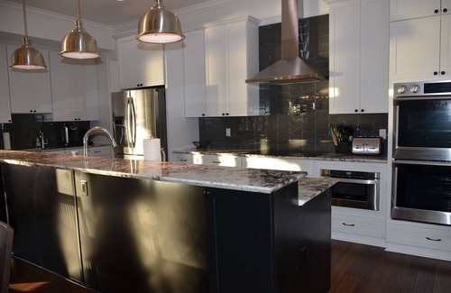 - Granite countertops throughout the kitchen, including on the nearly 13' island