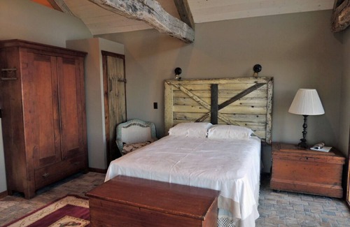The Wine Haus room features interesting items collected over years of traveling in the wine country of France. Relax with a good book in one of the comfy chairs by a window or venture onto the deck to enjoy the valley view and the sounds of the forest around you. Unique features are a handmade bar countertop, hand-hewn barn beams and an antique walnut wardrobe.