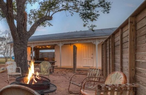 The Cora, a converted granary offers a peaceful escape for two, with a king-size bed, full bathroom, sitting area with Roku TV, kitchenette, and a porch with views of the Texas sky—perfect for sunrise coffee or sunset unwinds.