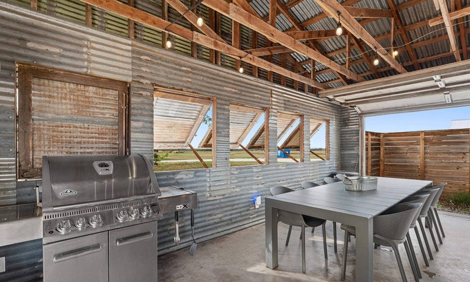 Step outside into your own private compound—complete with a fire pit, covered party barn featuring a hot tub, grill, outdoor Roku TV, dining area, and cornhole setup. There’s plenty of space to gather, laugh, and toast to a perfect hill country evening.