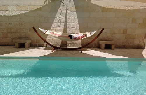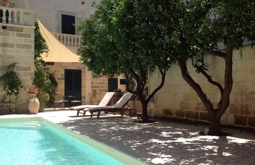 Palazzo Umberto is a historic residence of considerable value located in the ancient village of Poggiardo, one of the most beautiful in Salento, near the crystalline sea of Castro (3 KM), the spas and caves of Santa Cesarea, as well as the golden beaches of Otranto. Behind the building there is a delightful garden, a countryside with orange trees, with a wonderful salt water swimming pool set in white stone, equipped with whirlpool and piped music. By the pool there is the citrus grove that acts as a natural umbrella above comfortable and relaxing sun loungers. The ancient structure has a strategic position: every day you can reach a different beach choosing from the most beautiful ones. Near the spa for wellness and body care treatments. Free WI FI Internet, Sky, English TV