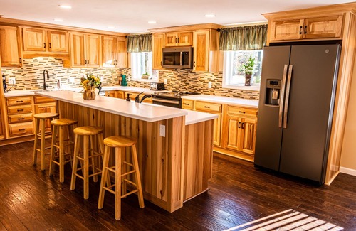 Cozy and comfortable getaway, close to Wisconsin Dells but far enough away. Our ranch style house is situated on 36 acres featuring our winery, vineyard, walking paths, 9 hole disc golf course, and plenty of deck space to relax. The house is newly renovated with hardwood floors and cabinets, solid surface counter tops, large island with stools and a bar sink. Both bedrooms have attached bathrooms that include tile floors and tiled walk in showers. The living room features a hide a bed in the couch, and a half bath nearby for additional guests.