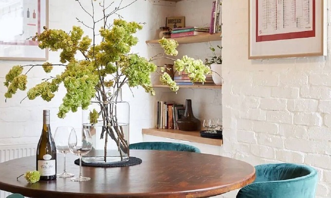 The wine-themed Dining room features more handmade bricks, timbered shelving, luxe velvet chairs, and all the essentials for a fabulous night in.