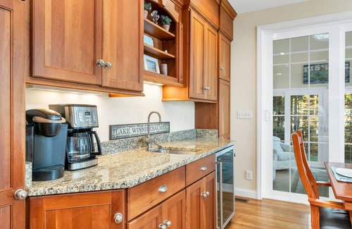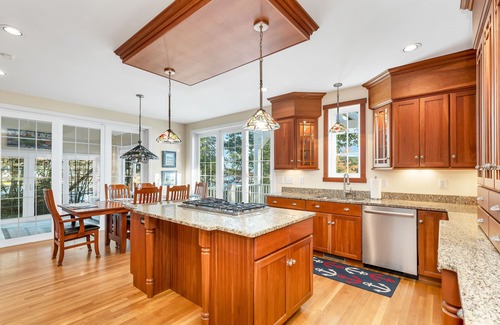 Your luxury Winnipesaukee vacation awaits. The minute you step out of your car and onto this property, you will instantly feel relaxed and at home. The custom 3-story home was designed and constructed by a national award-winning builder and offers panoramic views of the lake and mountains. The manicured grounds offer a sand beach, large U-shaped dock (will hold one 24' boat plus two 22' boats), patio and decks. Inside, the living room gives you 2-story windows to take in the stunning views. This room also has a fireplace with a large-screen TV above (sorry, the fireplace is off limits). Next to the living room is the pool table room, complete with pub tables to relax and watch the game while awaiting your turn. The kitchen is amazing - you'll want to be the chef of your wood cabinets, granite counter tops, prep sink, the list goes on and on. Off the kitchen is the sun room where you can relax with your morning coffee or curl up and finally get to that book all your friends are talking about but you haven't found the time to read. The master bedroom is on the first floor and has stunning views through the slider accessing the private deck, a beautiful bath with shower stall and jetted tub, and a TV for catching up on the news before making your plans for the day. The first floor also has a comfy TV room. Up one flight you will find a lovely sitting area overlooking the living room and through the glass to the stunning views. In addition, there is a bedroom with a king bed and a bedroom with a queen bed (this bedroom has gorgeous lake views). These two bedrooms share a bath with a separate shower stall and jetted tub. There is also a bedroom with a queen bed and its own private bath and a bedroom with a queen bed and a relaxing couch for lounging with an additional room off it with 2 twin beds. There is yet another bathroom with a shower stall on this floor. The last bedroom on this floor has a queen bed and beautiful lake views. Just when you think it couldn't possibly get any better - go up to the third floor! There you will find a kitchenette AND another bedroom with 4 twin beds, 1 double bed and a bath with jetted tub and shower stall. The furnishings and decor in this home are impeccable and loaded with lake charm. Gather your family and friends - this will truly be your vacation of a lifetime