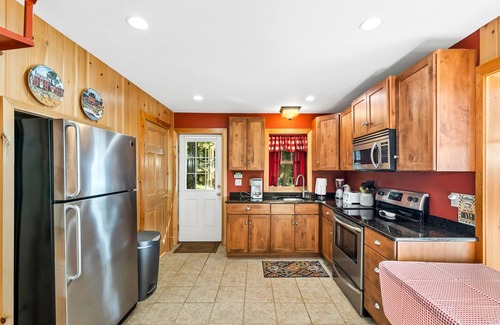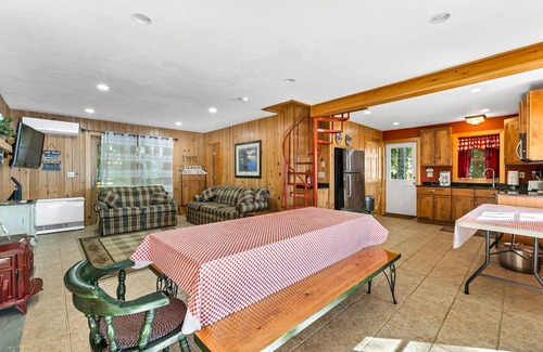 Open concept living area on the main level with knotty pine walls, the full-size sofa pulls out into a queen-sized sleeper for additional sleeping accommodations. With the queen sleeper sofa and three bedrooms, this home can accommodate up to eight guests.