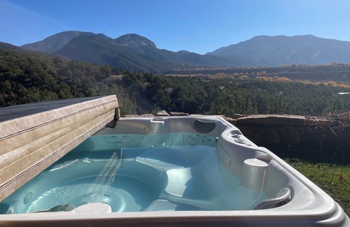 Luxurious 3300 sq ft Passive Solar, 3 Large Bedrooms, 1 small bedroom with queen, 3 queen size beds, 1 king, and one full sleeper couch, 2 bathrooms, 2 walk in closets, Hot Tub, Steam Shower, Master bath with mountain views through tropical greenhouse, Large tropical indoor greenhouse off kitchen and living room, dishwasher, washer and dryer, brand new refrigerator, viking range, high ceilings, radiant heat, passive solar is warm in winter, cool in summer, indoor and outdoor rock walls, terraced organic vegetable and flower gardens, Saltillo tile throughout, 2 brick and flagstone portals with unbelievable views, large shade trees, Photovoltaic solar panels on roof, 15 min to ski lifts, 15 min to plaza. All wheel drive or 2 wheel drive with mud and snow tires recommended for inexperienced winter drivers during ski season.