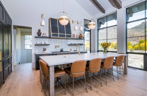 Nearly 180-degree views of the surrounding mountains and Western landscape greet guests in the second-level great room. Cooks of all calibers will love the gourmet kitchen, complete with wine refrigerator and ice maker—or hire a private chef to craft bites to share at the 6-seat breakfast bar and 10-person dining table. For larger groups there is an extra refrigerator and dishwasher in the pantry off the kitchen.