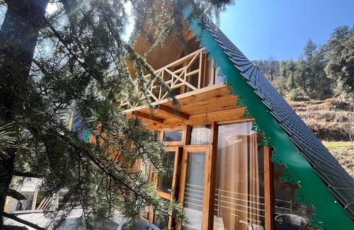 Experience a unique stay in our A-frame treehouse in Jibhi, Himachal Pradesh. A majestic cedar tree grows right through the balcony! This cozy wooden duplex comfortably sleeps 4 and offers both convenient road access and peaceful seclusion on our private land.