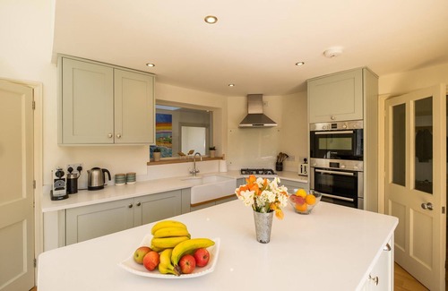 Kitchen/Dining Room: Open plan kitchen/dining area with dishwasher, electric double oven, combi oven, gas hob, fridge, microwave, Nespresso coffee machine, dining table for twelve guests. Large bi-folding doors open out into the garden