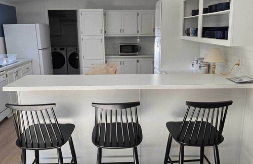 Inside, you’ll find a light-filled, airy interior with mid-mod decor, a fully equipped kitchen, and plenty of space to unwind. The home comfortably sleeps your entire group with three spacious bedrooms (2Q and 2F beds) and two full baths. It's fully air-conditioned for warm days and stocked with cozy blankets for cooler evenings. You’ll find everything you need, from fresh linens, beach towels, and a Blackstone griddle (propane provided), to truly settle in and enjoy.