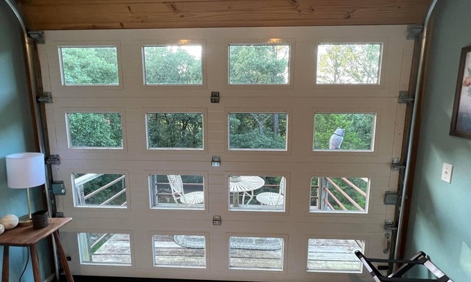 The staircase is quite unique as it was salvaged from an old Corp of Engineers dock years ago. At the top of the stairs, you will find a comfortable queen bed on the landing. With its unique overhead garage door feature, it opens to a rustic designed balcony for two overlooking the woods below. (A privacy screen is provided to create more of a private bedroom experience for our guests.) There is a clothes rack with hangers for your use.
