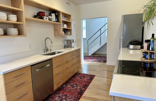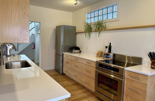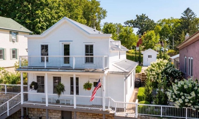 4 bedroom 2 bath, accomodates 8 guests (maximum 10) We are across the street from both the Root River and Root River bike trail. Walking distance to all the City of Lanesboro has to offer! Ride your bicycles right in and out of our street level secure basement entry. This area has dedicated outlets for ebike charging, washer and dryer, extra refrigerator/freezer and storage. First level has a living area with balcony that looks over Elmwood Street and Parkway Ave. Beautiful kitchen, dining room, bathroom with walk in shower and queen bedroom. Access to beautiful courtyard with outdoor dining and grill. Top floor has living room with direct access to landscaped backyard, office and full bath with deep soaker tub/shower. 1 private queen bedroom and one king bedroom (semi-private, converted 3rd living room) with balcony overlooking the city with an adjacent kids bedroom room with two standard twin beds. 3 night minimum.